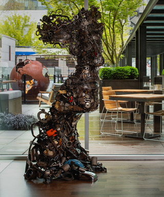Fabricated as a larger than life portrait from recycled material and tools, Metamorphosis III sends a powerful message of personal reflection about sustainability and the human impact on nature.