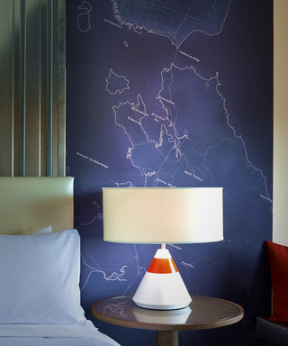A map of San Francisco Bay running across the ceiling with ports of call clearly defined, so guests can lay in bed and guess where the sailing ships are headed in Julie Coyle's piece, Shipping Lanes.