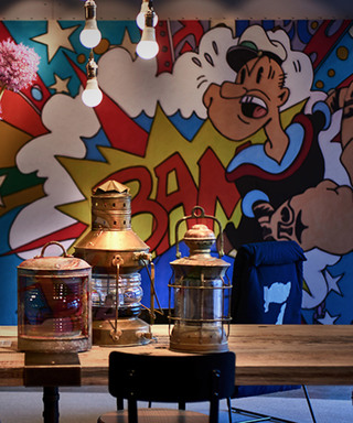 A graffiti mural in the Zephyr lobby, Hooligan’s spoofs the rowdy life of the colorful characters historically working the Wharf, conveying how life on the Bay is always a ruckus.
