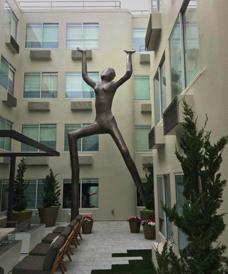 The communal courtyard features the eight-foot-tall metal sculpture Zoe, designed by Shawn Man Roland in celebration of the hotel’s whimsical, curious, spontaneous and free-spirited muse.